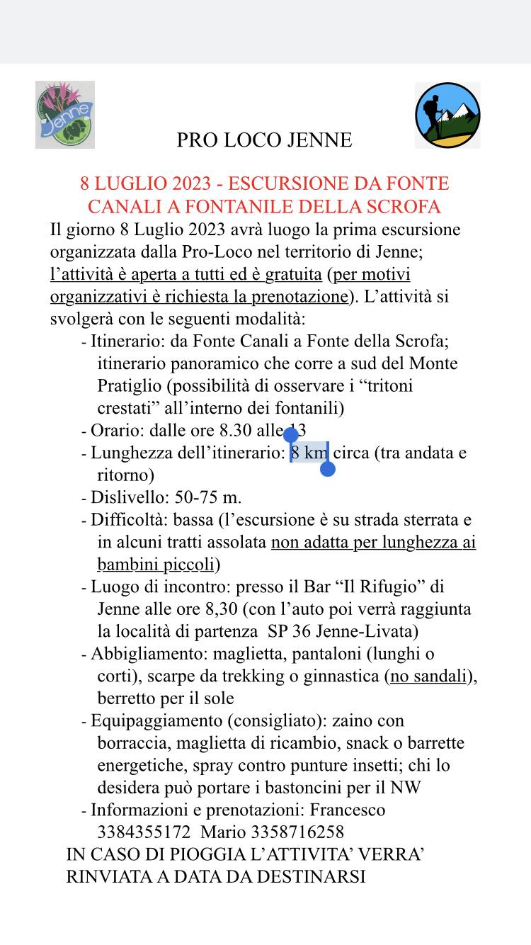 JENNE 28 giugno 2023  – Avvio dell’estate in grande stile a Jenne. Primo appuntamento è per l’8 luglio 2023 con l’edizione 2023 de “La Jennesina”, nota gara podistica sul falsopiano definito il più bello del mondo.  La partenza è per le ore 18.00 oltre dieci i kilometri da percorrere con partenza dal Monastero di Santa Scolastica ed il tradizionale arrivo a Jenne. L’organizzazione è magistralmente curata dalla Asd Tivoli Marathon, il cronometraggio da Race Service. Ma nella stessa giornata spazio anche ad una iniziativa intrapresa dalla Pro Loco di Jenne: una esclusiva escursione nel tratto Fonte Canali – Fontanile della Scrofa. Di seguito tutte  le informazioni sia relative alla Jennesina che all’escursione: