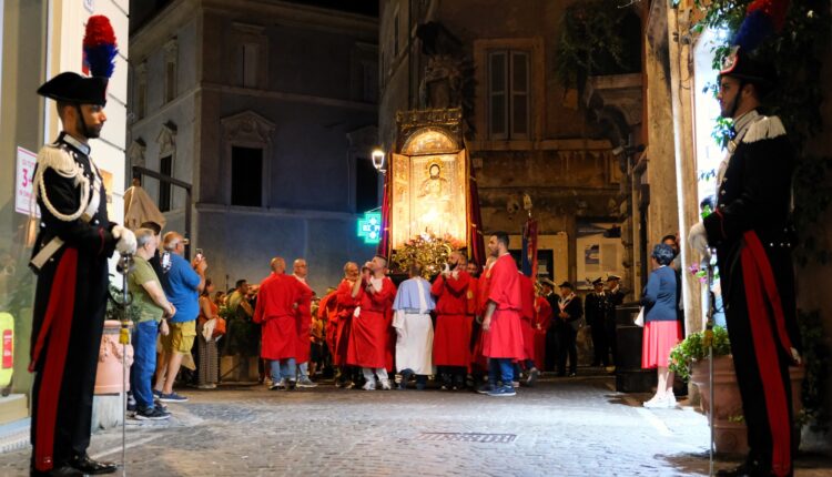 TIVOLI – Come ogni 14 agosto, a Tivoli si celebra à la tradizionale cerimonia dell’Inchinata. L’immagine del Santissimo Salvatore, esposta dalla  mattina presso la Cattedrale di S. Lorenzo Martire,per poi spostarsi  in processione fino a Piazza Trento per la storica Inchinata con la Madonna delle Grazie, esposta invece nella Chiesa di Santa Maria Maggiore. Alle 21.00 dal Duomo ha avutoinizio la processione, alle 21.30  la benedizione delle acque dell’Aniene.  Quest’anno la manifestazione è stata particolarmente sentita e partecipata per i 500 anni dalla sua istituzione. Una storia destinata a diventare millenaria.