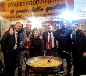 Ovindoli – Un grande successo ha fatto riscontrare “la pasta alla gricia” ed il prelibalto “risotto al montepulciano” preparati rigorosamente in live con la padella spaziale del Ristorante Angeletta di Carsoli. Lo stand allestito nell’ambito della manifestazione “Ovindoliamor” ha caratterizzato lo street food nell’ambito di una singolare proposta dedicata all’evento celebrativo per eccellenza dell’enogastronomia in marsica. Si tratta della decima edizione per Ovindoliamor che venerdì sera ha fatto riscontrare il pienone con migliaia di persone arrivate nel centro storico per degustare vini di tutte cantine abruzzesi, e gustare quindi piatti tipici del Parco Sirente-Velino e non solo. Il tutto accompagnato da musica di artisti di strada. Tanta gente anche Sabato 25 dove alle ore 21:30 si è esibita Irene Fornaciari, giunta ad Ovindoli in una delle sue tappe del “Questo Tempo Tour”. La celebre cantante nata a Pietrasanta ha estasiato il numeroso pubblico con le sue canzoni, la sua voce energica e la sua grinta. Presenti anche i supervisor dei sommerlier Daniele Berardini e Mario Flammini. Angela Palombo, patron di Angeletta è anche sommelier delegata della Fisar L’Aquila.