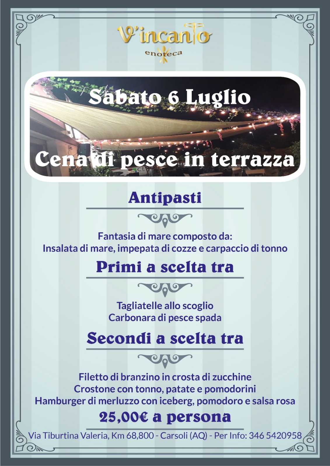 Carsoli – Prosegue in grande stile l’estate al V’incanto Enoteca di Carsoli, un locale cult che si sta sempre di più caratterizzando per la convivialità, il gusto e la particolare attenzione ai prodotti tipici. Iniziando dalla Birra del Borgo e per proseguire ad ogni dettaglio nelle materie prime utilizzate per i servizi di cucina, ormai apprezzati nel Lazio ed in Abruzzo. V’Incanto Enoteca è tappa per molti viaggiatori che a due passi dall’autostrada trovano in questo locale un ambiente elegante, nel contempo che mette tutti a proprio agio. La forza dell’estate è l’amplissimo terrazzo panoramico, opportunamente allestito per aperitivi, cene conviviali e musica all’aperto in live. E per luglio il V’Incanto, tra le altre serate propone per il giorno sabato 6 luglio la cena a base di pesce, e poi sabato 13 grande serata con il produttore Tommaso Olivastri e music Live Max Liga (cover Ligabue)