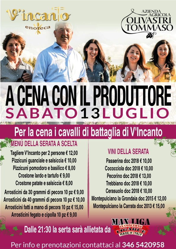Carsoli – Prosegue in grande stile l’estate al V’incanto Enoteca di Carsoli, un locale cult che si sta sempre di più caratterizzando per la convivialità, il gusto e la particolare attenzione ai prodotti tipici. Iniziando dalla Birra del Borgo e per proseguire ad ogni dettaglio nelle materie prime utilizzate per i servizi di cucina, ormai apprezzati nel Lazio ed in Abruzzo. V’Incanto Enoteca è tappa per molti viaggiatori che a due passi dall’autostrada trovano in questo locale un ambiente elegante, nel contempo che mette tutti a proprio agio. La forza dell’estate è l’amplissimo terrazzo panoramico, opportunamente allestito per aperitivi, cene conviviali e musica all’aperto in live. E per luglio il V’Incanto, tra le altre serate propone per il giorno sabato 6 luglio la cena a base di pesce, e poi sabato 13 grande serata con il produttore Tommaso Olivastri e music Live Max Liga (cover Ligabue)