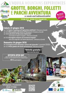 Inserita all’interno del cartellone di eventi regionali “Abruzzo Open Day Summer 2018”, la manifestazione è organizzata dall’Amministrazione comunale di Carsoli, in collaborazione con la DMC AQ Abruzzo Qualità e la Riserva Grotte di Pietrasecca, gestita da Aliena srl e Sherpa coop, con l’obiettivo di promuovere, valorizzare e dare un assaggio delle diverse risorse del territorio: le grotte carsiche, la Riserva, con la rete sentieristica e le specie faunistiche e floristiche che la abitano, nonché il suggestivo abitato di Pietrasecca, e il divertente Parco Avventura.