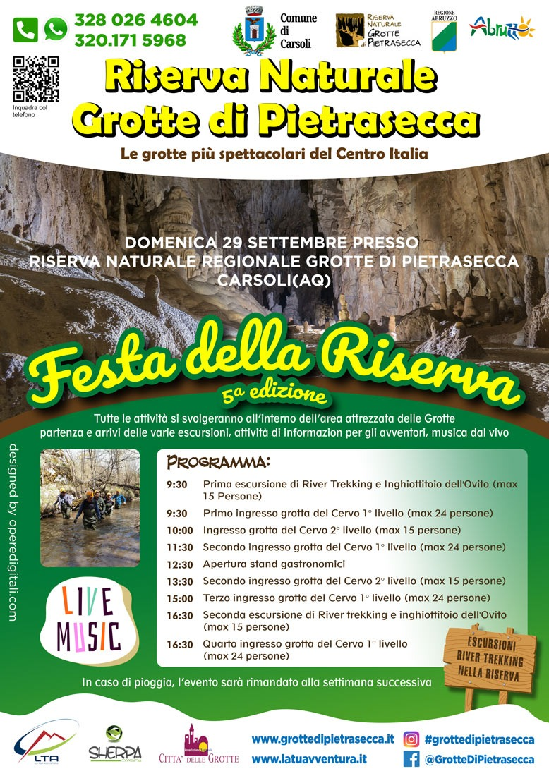 Carsoli – River trekking, musica dal vivo e street food con tipicità locali, animeranno la Riserva delle Grotte di Pietrasecca di Carsoli, domenica 29 settembre, per la quinta edizione della “Festa della Riserva”.