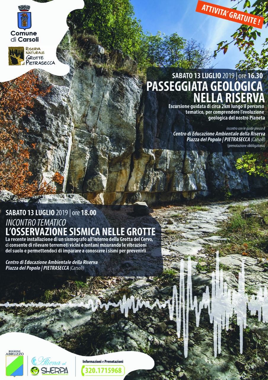 Pietrasecca – Una giornata aperta ad appassionati e curiosi per scoprire e conoscere l’evoluzione geologica della nostra terra grazie ad attività gratuite organizzate dal Comune di Carsoli e Riserva Grotte di Pietrasecca, gestita da Aliena srl e Sherpa coop. L’iniziativa, nata dal voler condividere le conoscenze e curiosità fornite dal sismografo installato recentemente nella Grotta del Cervo, uno dei pochi installati all’interno di cavità carsiche, capace di registrare gli spostamenti del terreno, fino a migliaia di kilometri di distanza, inizierà alle 16,30 con appuntamento presso il Centro di Educazione Ambientale della Riserva a Pietrasecca (Piazza del Popolo) per un’escursione guidata su uno dei sentieri più affascinanti della Riserva, alla scoperta delle tracce dell’evoluzione geologica della nostra terra. (Prenotazione obbligatoria al 3201715968) Si proseguirà alle 18, sempre presso il Centro di Educazione Ambientale, con l’ “Osservazione sismica nelle Grotte – incontro tematico sulla recente installazione di un sismografo all’interno della Grotta del Cervo ci consente di rilevare terremoti vicini e lontani misurando le vibrazioni del suolo e ci permette di imparare a conoscere i sismi per prevenirli”.
