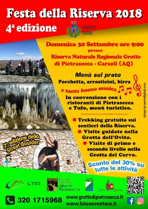 Carsoli – C’è grande attesa per l’appuntamento annuale giunto ormai alla sua quarta edizione. Domenica 30 settembre dalle ore 9.00 si aprono le porte della Riserva Naturale Grotte di Pietrasecca per una intera giornata tutta da vivere all’insegna delle meraviglie naturali e della suggestiva location situata presso Pietrasecca (frazione del Comune di Carsoli). Un evento celebrativo che consente ogni anno di apprezzare sempre di più questa risorsa naturalistica del territorio che offre ai visitatori uno spettacolo unico nelle viscere della terra. La festa della Riserva prevede visite di primo e di seondo livello nella grotta del Cervo, visite guidate nella grotta dell’Ovito, Trekking gratuito sui sentieri della riserva per una esperienza unica e sicuramente da ricordare. Ci sarà spazio anche per buona musica e convivialità con degustazioni di porchetta, arrosticini e birra. Per ulteriori informazioni: 320-1715968