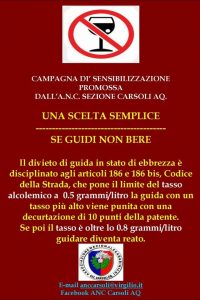La guida in stato di ebbrezza è una delle cause più frequenti di incidenti gravi o mortali. Su questo fronte è scesa in campo l’Associazione Nazionale Carabinieri di Carsoli, la quale è scesa in campo sul web e social con una specifica campagna informativa sui rischi connessi a questa problematica sociale. L’anc pone l’attenzione sui parametri che costituiscono un vero e proprio reato che si commette in determinate situazioni. E dunque molte vite, e molti incidenti possono essere evitati utilizzando il buon senso, divertendosi ma rispettando i parametri imposti dalla legge.