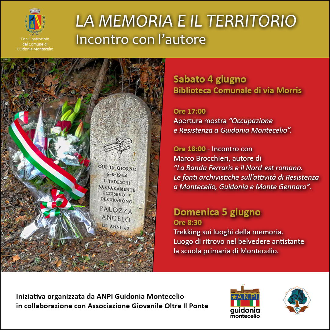 GUIDONIA – La Sezione ANPI Guidonia Montecelio in collaborazione con l’Associazione Giovanile Oltre Il Ponte organizza il 4 e 5 Giugno 2022 una due giorni dedicata alla memoria storica del nostro territorio, in particolare sui fatti che hanno segnato il nostro comune nella Seconda Guerra Mondiale: L’occupazione Nazifascista, La Resistenza ad essa e cittadini di Guidonia Montecelio morti durante quei difficili mesi: