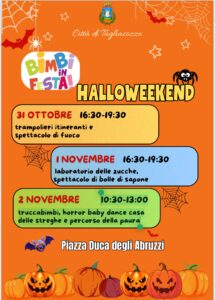 Si inizia venerdì 31 ottobre, dalle ore 16.30 alle ore 19.30 con trampolieri itineranti e spettacolo di fuoco in Piazza Duca degli Abruzzi; sabato 1º novembre, stessi orari, si avranno il laboratorio delle zucche e lo spettacolo con le bolle di sapone e infine, domenica 2, dalle ore 10.30 alle ore 13.00, il truccabimbi, l’horror-baby dance e la casa delle streghe con il percorso della paura!