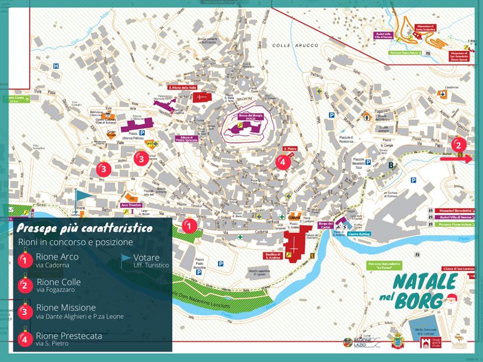 Nella mappa a corredo  sono riportati tutti i rioni in gara, nonché la sede deputata al voto: l’Ufficio Turistico del Comune di Subiaco (l.go Sodoma). E’ possibile votare dalle ore 10.30 alle 17.30 dal martedì alla domenica, fino al 6 gennaio 2020.