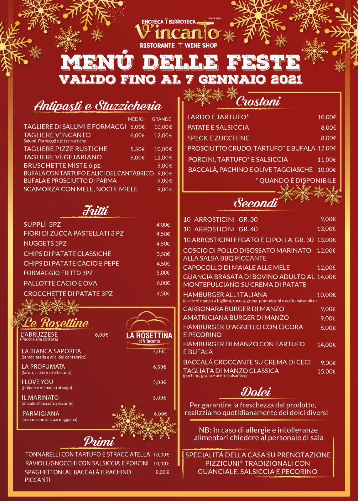 IL MENU’ DELLE FESTE – Ma si può anche ordinare negli altri giorni sempre asporto con ritiro presso il locale o consegna a domicilio questo il menù aggiornato: