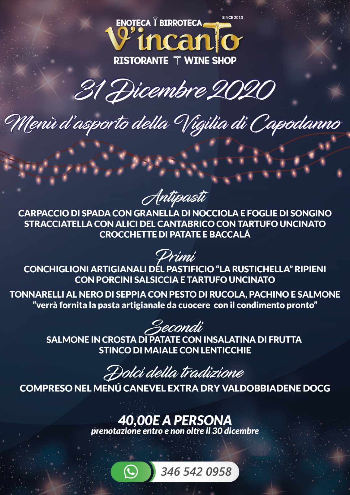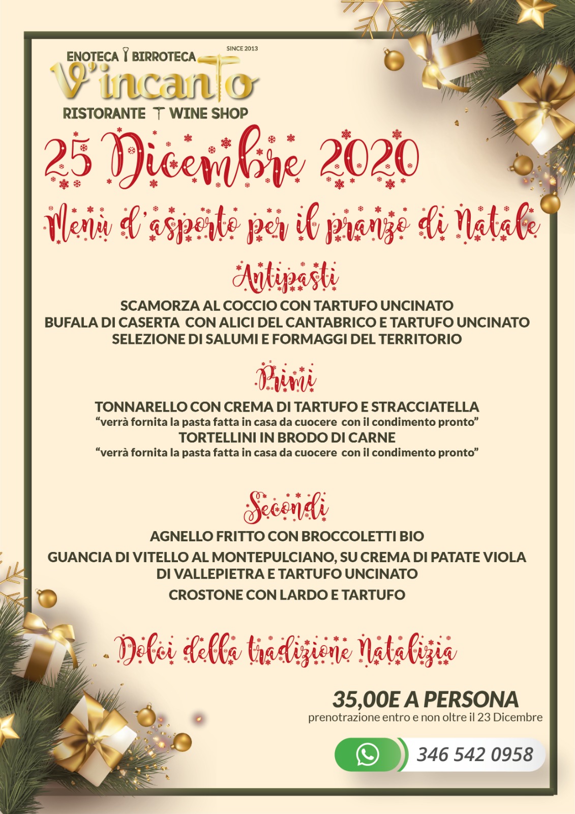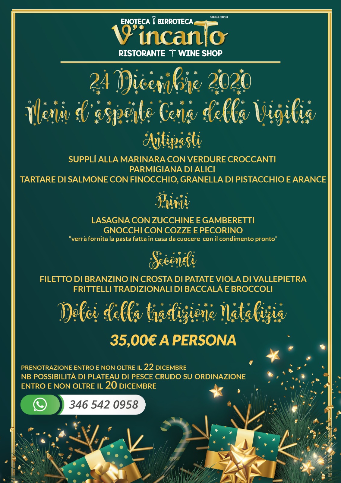 Si parte con il 24 la Vigilia di Natale: un cenone completo così come per il pranzo di Natale e per il cenone del 31 dicembre 2020: occasione per salutare il nuovo anno seppur in modalità diversa ma senza venir meno ai piccoli piaceri della vita: il gusto.