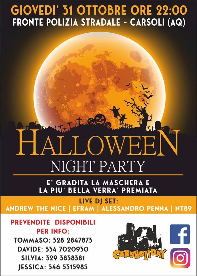 Carsoli – Una iniziativa intrisa di divertimento apre le porte del Comitato Carsholiday 2019: arriva l’Halloween Night Party, per vivere insieme la festa rituale dell’anno. L’appuntamento è per giovedì 31 ottobre 2019 dalle ore 22 in poi sulla S.S. Tiburtina Valeria (Zona commerciale) fronte Polizia Stradale in Carsoli.