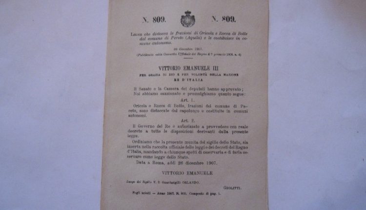 Redazione – Avvenne agli inizi del 900, precisamente con un Regio Decreto del 26 dicembre 1907 giorno di Santo Stefano, la proclamazione della Legge che ebbe a distaccare le frazioni di Oricola e Rocca di Botte dal Comune di Pereto. Una autonomia decisa dal Re Vittorio Emanuele III che caratterizzò in maniera incisiva le due realtà fino ad allora frazioni di Pereto.