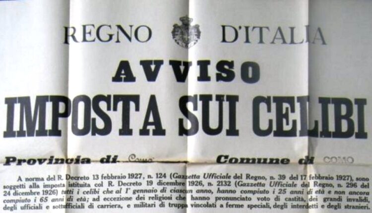 Il celibato, nella prima metà del secolo scorso, era una condizione davvero “sconveniente”. Non tanto da un punto di vista etico – che avrà comunque influenzato le scelte del legislatore – quanto da quello fiscale. Il 13 febbraio 1927, infatti, fu istituita in Italia l’imposta sui celibi, applicata in diversa misura a seconda dell’età dei non maritati. Quelli più giovani, tra i 25 e i 35 anni, pagavano un fisso di 70 lire, dai 36 ai 50 anni il tributo saliva a 100 lire e, dai 51 ai 65, invece, scendeva a 50 lire. Dai 66 anni non si versava più. Tali importi, nel tempo, subirono anche due aumenti, nell’aprile 1934 e nel marzo 1937, con una aliquota aggiuntiva che variava a seconda del reddito dell’obbligato. Il gettito derivante da questa imposta era, poi, devoluto all’“Opera nazionale Maternità e Infanzia”: in sostanza chi non si faceva una famiglia era tenuto ad aiutare economicamente chi, invece sceglieva di procreare. L’imposta sui celibi fu abolita dal governo Badoglio il 27 luglio 1943.