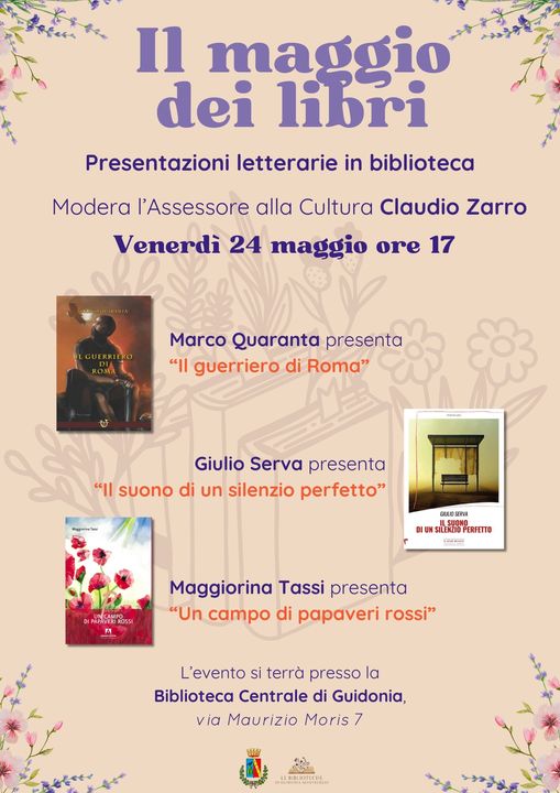 Guidonia Montecelio – In occasione dell’iniziativa culturale “Il Maggio dei libri”, organizzato dal comune di Guidonia Montecelio, si terrà venerdì 24 maggio alle ore 17, presso la Biblioteca Centrale, un grande appuntamento che prevede le presentazioni letterarie di tre autori: con il suo libro , invece porterà la sua opera ed infine l’autrice presenterà .