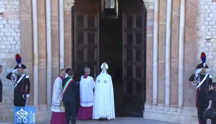 L’AQUILA – E’ storia mondiale della Chiesa Cattolica Italiana. Alle ore 11.e 43 minuti del 28 Agosto 2022 il Sommo Pontefice Papa Francesco ha aperto la Porta Santa della Basilica di Santa Maria in Collemaggio nella città dell’Aquila. Dopo aver ricevuto il ramo d’ulivo dal sindaco Pierluigi Biondi, Sua Santità l’ha battuta per 3 volte sulla Porta Santa, poi l’apertura solenne. Quindi l’ingresso emozionante in Basilica. Il Pontefice è stato seguito dal corteo processionale e si è subito recato presso il Mausoleo di Celestino V ove si è raccolto in preghiera per diversi minuti.