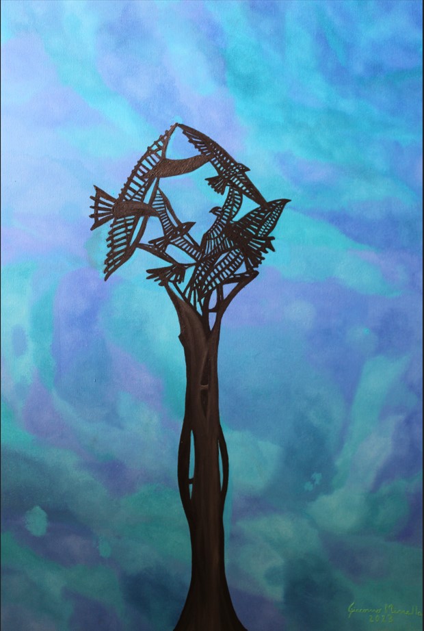 Per omaggio all’opera monumentale “In volo” realizzata dall’artista Robert Cook in collaborazione con Fabrizio Naggi ed eternante la memoria del maestro nella città d’arte Canale Monterano di Roma, il dipinto del Minella rappresenta il divenire dell’essere, la dinamica inarrestabile della vita, che irrora come sangue il corpo bronzeo dell’opera. È la catarsi dal soverchio materiale e la vittoria dello spirito vitale, del movimento di slancio del vivere. Le linee di forza partecipano l’accoglienza di un grembo sempiterno, gestante la danza delle infinite manifestazioni formali. Investe tutti i sensi insieme la sinestesia profonda che lega lo stormire al vento delle fronde allo stormo roteante del volo degli uccelli, il battito delle ali indistinto a quello del cuore, evocato dall’abbraccio unitario della viva anatomia umana e della corteccia vegetale e magnificata dalla levata eco celeste minellana della vita in turbinoso eterno ritorno. La dialettica oppositiva alterna i pieni ai vuoti materici, a rivelare che l’assenza è parte integrante dell’essenza, ne è la meraviglia stessa, il senso: è la condizione indomita del movimento di metamorfosi, al di là della forma della coscienza, per una rappresentazione in transito di verità. È eterna filogenesi che, come ispira la poesia minettiana in basamento, “corona infinito muovere di vita”.