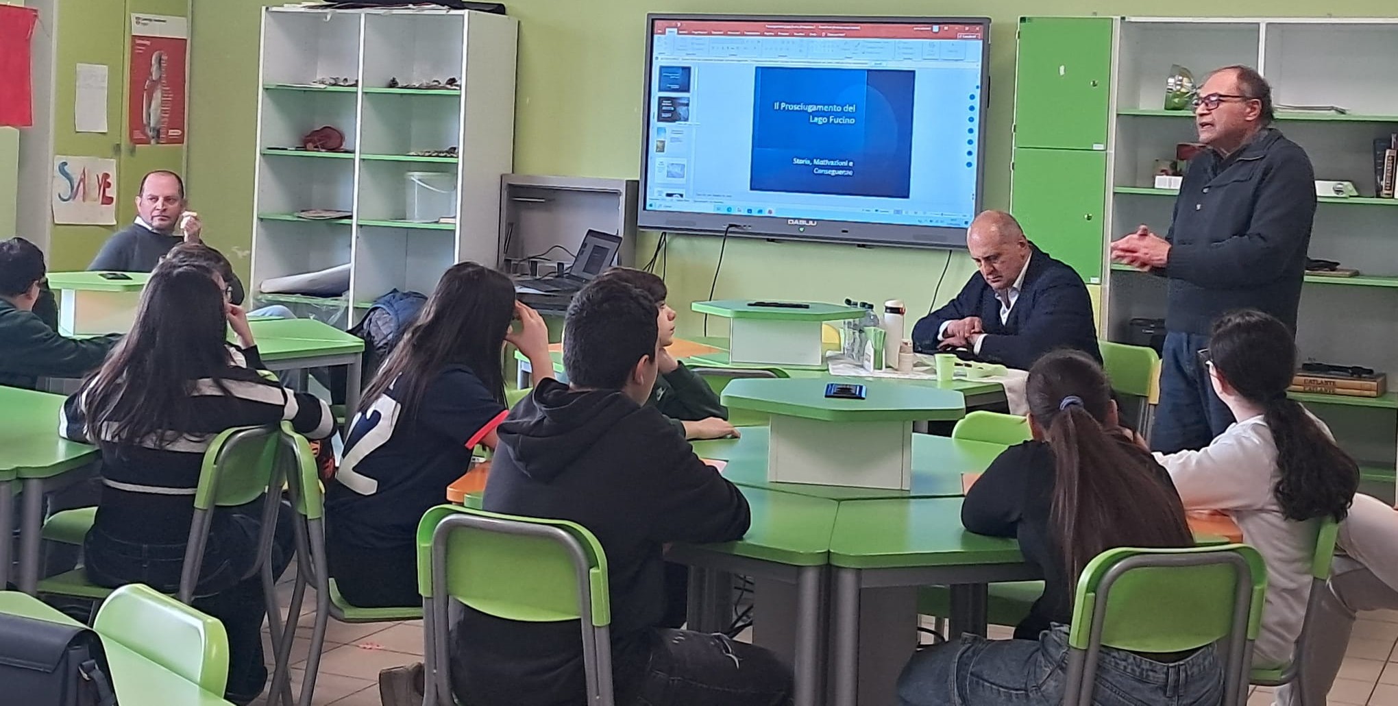 Esso uscì in Svizzera, nel 1933, in lingua tedesca, con il quale l’autore pescinese esalto’ il riscatto dei suoi “cafoni”, diventando l’epopea della lotta contro tutti i soprusi del regime fascista e degli agrari, con figure simbolo come Berardo Viola, nel film di Carlo Lizzani, con il volto di un giovane  Michele Placido. Ancora una volta, gli studenti dell’I.C. “Vivenza-Giovanni XXIII” (diretto dalla dirigente scolastica, Dott.ssa Franca Felli) guidati dalla Prof.ssa Catia Di Battista, hanno risposto con grande entusiasmo a tutti gli stimoli ricevuti dai relatori, anche dopo la visione di numerose “slides” tecniche, illustrate da Alessandro Raschiatore (a nome del Consorzio di Bonifica Ovest), sul prosciugamento del grande invaso: un’opera idraulica considerata tra  le grandi meraviglie dell’ingegno tecnico dell’intero ‘800. Essa però aveva riaperto le opere già realizzate secoli prima, con il primo parziale svuotamento ordinato dall’imperatore romano Claudio, (con i suoi famosi “Cunicoli”), nipote di Giulio Cesare, ripresi e poi estesi dagli ingegneri incaricati dal Principe Alessandro Torlonia, che in oltre 25 anni  riuscirono nell’impresa di far defluire tutte le acque verso il fiume Liri. Una suggestione del terzo lago italiano sempre viva, che è stata riaccesa con la visione di una sua ricostruzione virtuale, attraverso l’uso della Intelligenza artificiale, quasi come presagio che la natura comunque tende a riprendersi tutto  quello che l’uomo vuole dominare e trasformare.