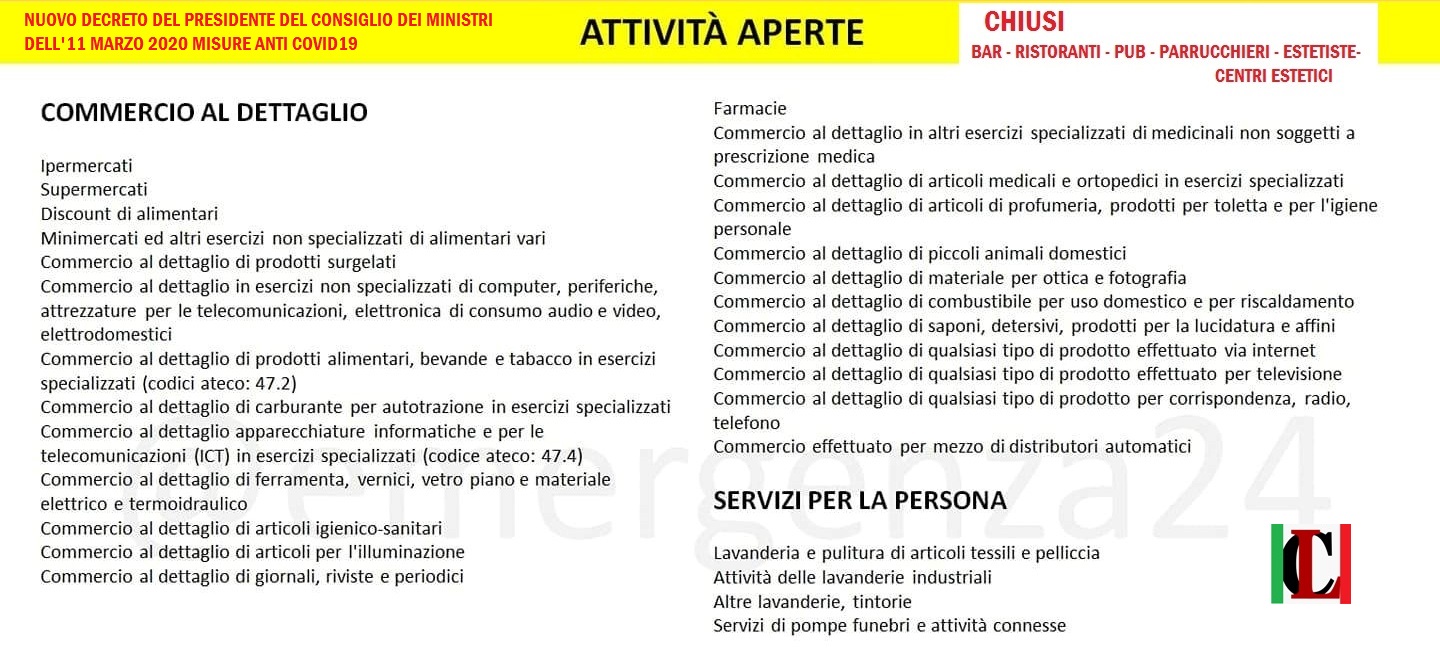 Clicca qui per scaricare il Decreto in originale. Negli allegati sono visualizzabili le categorie che possono restare aperte tra cui negozi di apparecchiatura informatica, ferramenta e vernici,