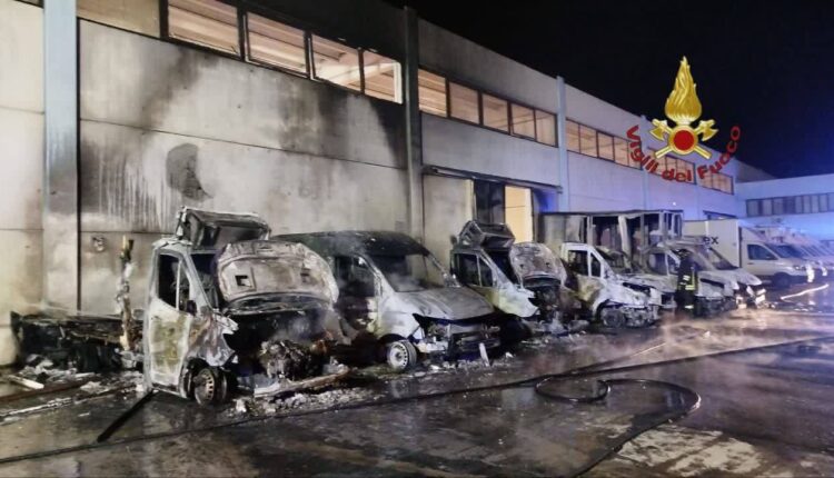 Il rogo ha coinvolto nove furgoni parcheggiati all’interno del piazzale aziendale: sei mezzi sono andati completamente distrutti, mentre altri tre hanno riportato danni parziali. Le fiamme hanno inoltre interessato una parte della struttura dell’azienda, causando danni significativi agli edifici.