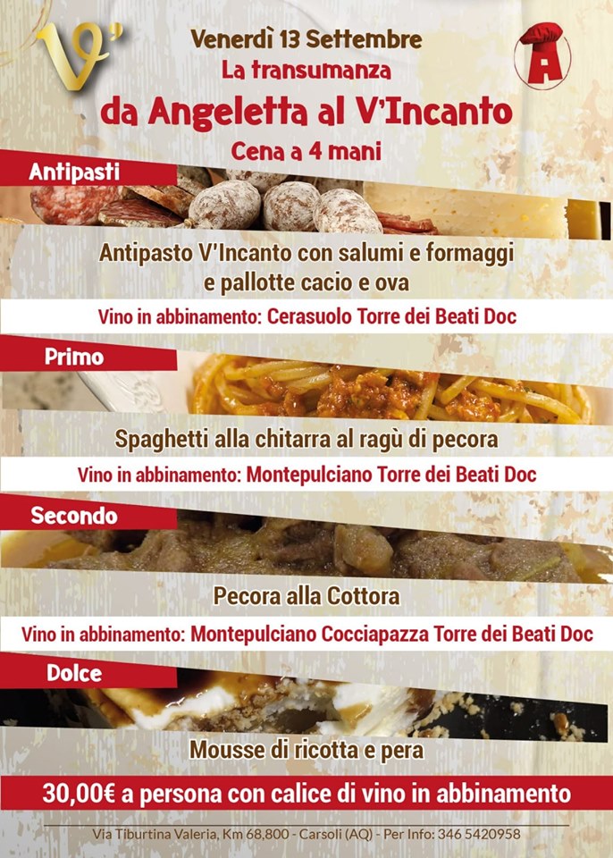 Carsoli – Nella logica di una proficua collaborazione il Ristorante Angeletta e V’Incanto Enoteca danno il via ad un percorso unico nel suo genere: La transumanza da Angeletta al Vincanto. Una serata, quella di Venerdì 13 settembre 2019 sicuramente da non perdere…