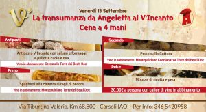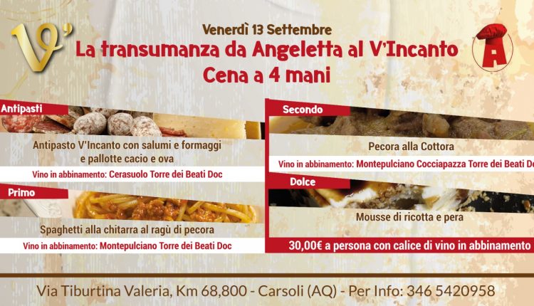 Carsoli – Nella logica di una proficua collaborazione il Ristorante Angeletta e V’Incanto Enoteca danno il via ad un percorso unico nel suo genere: La transumanza da Angeletta al Vincanto. Una serata, quella di Venerdì 13 settembre 2019 sicuramente da non perdere…
