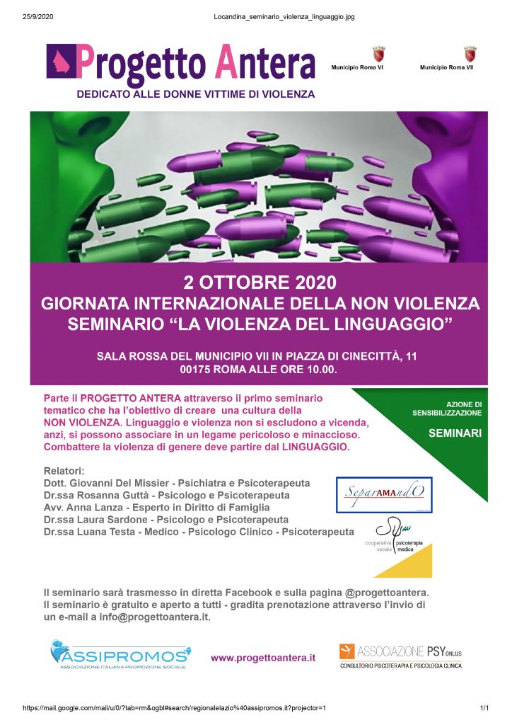 In occasione della Giornata internazionale della non violenza, il Municipio VII organizza un seminario per discutere di uno dei temi, il linguaggio, che più rivelano le dinamiche della violenza e in particolare della violenza di genere. Al seminario partecipano psichiatri, psicologi, psicoterapeuti ed esperti di diritto di famiglia. L’appuntamento è per mercoledì 2 ottobre alle 10 presso la Sala rossa del VII Municipio, piazza di Cinecittà 11.