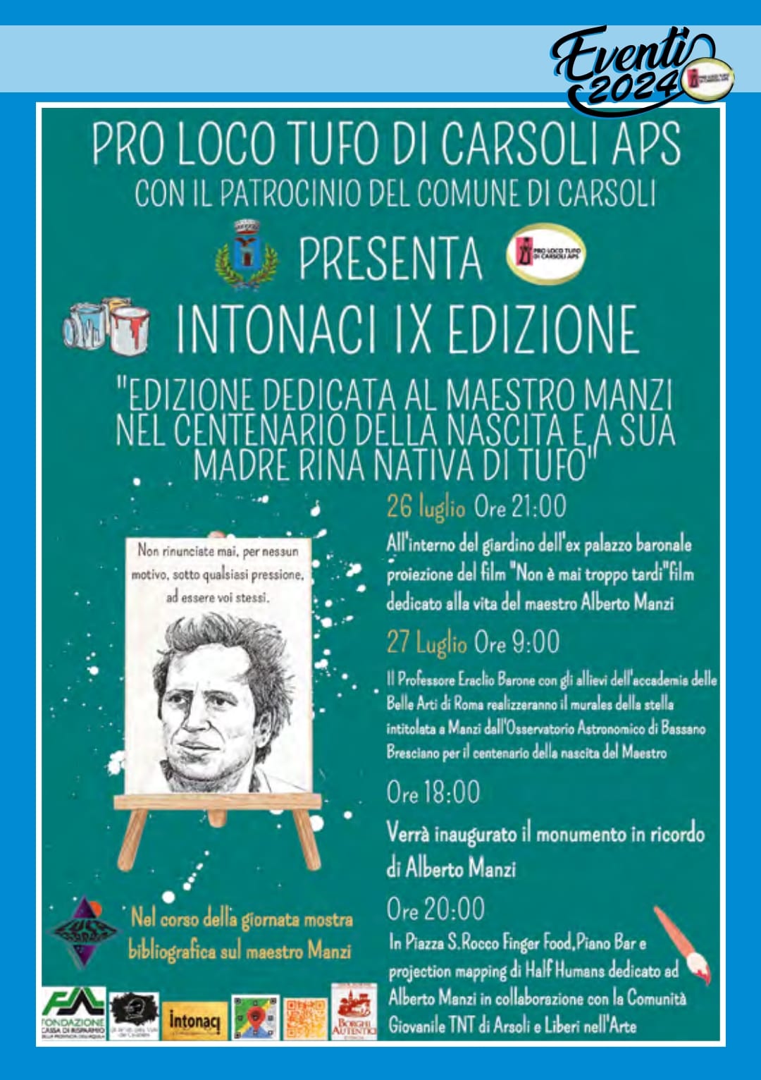TUFO DI CARSOLI – C’è grande attesa per la nona edizione della manifestazione “Intonaci” 2024. Quest’anno l’evento particolarmente atteso è dedicato al maestro Manzi nel centenario della nascita ed in omaggio alla madre originaria di Tufo, la signora compianta Rina.