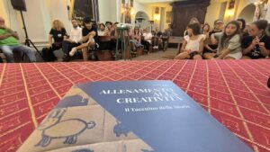 Tufo di Carsoli (AQ), 27 luglio 2025 – Conclusione in grande stile a Tufo di Carsoli la rassegna artistica Intonaci, che quest’anno ha festeggiato la sua decima edizione con un ricco programma di eventi culturali, mostre, installazioni e street art. Ieri eventi in sequenza di grande interesse: nel pomeriggio presentazione del libro dello scrittore e artista Stefano Bove Zhew, che si è svolta nella suggestiva cornice della Chiesa di San Giuseppe. La presentazione è stata curata da Daniele Imperiale, vice presidente dell’Ordine Regionale dei giornalisti d’Abruzzo, il quale ha introdotto la tematica in trattazione ripercorrendo l’importanza della street art in tutte le sue forme espressive soffermandosi sull’interessante percorso che ha caratterizzato il borgo di Tufo di Carsoli. Hanno relazionato: Paolo Morani, Lorena Bernardi, David Anzini ed il consigliere del comune di Carsoli Avv. Simone Cococcia in rappresentanza dell’amministrazione comunale.