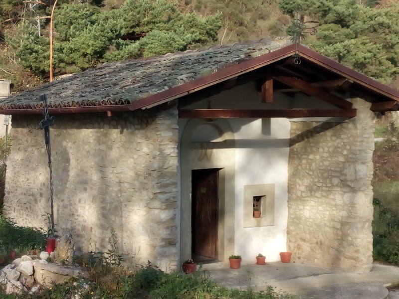 Descrizione edificio. Fronte all’edificio correva la vecchia consolare romana che costeggiava il fiume, tappa obbligatoria del viandante era quindi la piccola chiesa. Il tempio mostra un paramento esterno in pietra, con tessitura irregolare e serrata maggiormente nella zona retrostante con ciottoli e pietrame calcareo di raccolta,la messa in opera è a tecnica di stilatura. Sul tetto campeggia in bella mostra una croce in ferro di Augusto Serafini morto nel 1941, egregiamente restaurata dal mastro ferraio Eligio Eboli da Carsoli. La struttura ha misure interne: 6,10 metri in larghezza e 4,87 metri in lunghezza. L’entrata è divisa da un portico posticcio rispetto al corpo originario, da cui si evincono chiaramente gli agganci col cuci-scuci senza piedritti. La facciata ha un portale ad arco col sovraporta in stucco recante un monogramma mariano, Maria genitrice regina dei cieli, ascrivibile alla seconda metà del XIX secolo. Ai lati del portale d’ingresso sono due finestrelle con grate in ghisa raffigurante un giglio, l’operato a stampo sembrerebbe materiale di riutilizzo. La posizione bassa delle finestre è voluta, per obbligare il devoto ad una genoflessione per la preghiera, stante sicuramente chiuso l’adito in passato, rafforzando così la tesi di chiesa privata. Sul pavimento interno, non originale, troviamo un basamento tronco-piramidale in pietra proveniente da colle Sant’Angelo assimilabile a parte di un cero pasquale. L’aula con volta a botte ha un unico altare. Interessante l’acquasantiera col simbolo di due dita. La croce in bronzo posta sull’ara sacra è afferente la II metà dell’800. Al centro della parete sul finire dell’800 furono affrescati la vergine in trono col bambino e la croce sotto l’altare. Si evidenzia nel quadro centrale l’antica cornice dell’affresco sottostante con linee curvilinee tipiche del movimento pittorico decò di fine 800. Il pittore romano Ettore Monteleone, parente della famiglia Caffari di Carsoli, incaricato da Augusto Serafini, sovrappose all’originario affresco deteriorato, l’attuale apponendovi la data d’esecuzione 1946. In piena luce è facile cogliere i contorni del vecchio affresco con orientamento della Vergine opposto all’attuale. Altri elementi posticci completano l’arredato. In passato si svolgeva nei pressi della chiesa la gara della rucica, consistente nel far rotolare dei cerchi in ferro ricavati dai manici delle “cottore”antiche pentoloni in rame usati per cuocere nei camini delle case. Il sacro tempio abbisogna di restauro interno, magari recuperando l’antico affresco della Vergine in trono con accurato descialbo, che col chiarore del giorno mostra i contorni di un’opera da riscoprire e rivalutare.