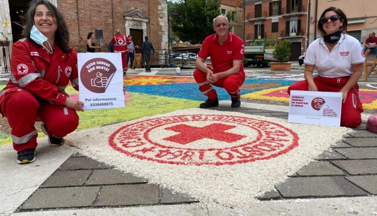 Carsoli – Sul selciato di Piazza Corradino i volontari della Croce Rossa di Carsoli hanno realizzato la croce con i fiori in occasione del Corpus Domini che è stato celebrato in piazza Corradino.