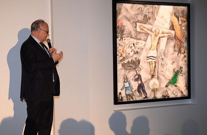“La Crocifissione Bianca è un’opera straordinaria, siamo davvero felici di poter ammirare questo capolavoro di Marc Chagall che esprime al tempo stesso le tragedie della guerra e della violenza e la luce della speranza, della fratellanza tra popoli e della capacità di guardare alla fraternità come un principio fondamentale”. Così il sindaco Roberto Gualtieri intervenuto all’inaugurazione della mostra.