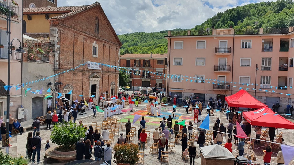 A Carsoli la Santa Messa è stata celebrata all’aperto in piazza Corradino come in molte altre realtà italiane. Ed al termine della celebrazione liturgica una piccola processione simbolica. La Pro Loco Carseoli si è comunque data da fare lavorando nottetempo per comporre qualche disegno in onore della festività più significativa per la fede cattolica.