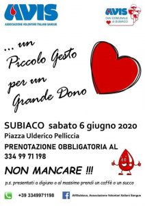 Subiaco – Anche ai tempi del Covid 19 non si fermano gesti di altruismo e di generosità. Sabato 6 giugno, presso piazza U. Pelliccia (Missione), Avis Subiaco effettuerà raccolta sangue.