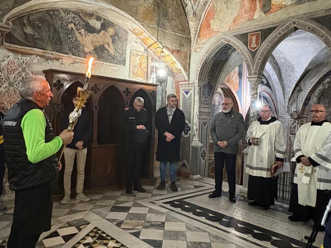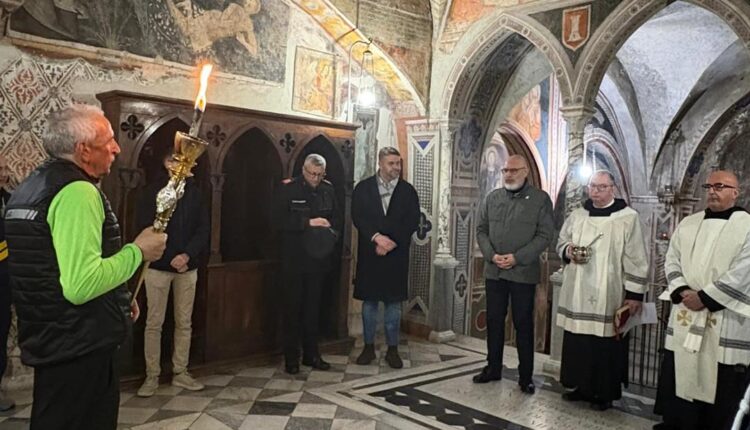 In serata, la fiaccola è giunta presso uno dei luoghi più suggestivi e simbolici dell’intero percorso: il Sacro Speco, monastero incastonato nella roccia e immerso nel silenzio della natura. Qui si è svolta una cerimonia particolarmente partecipata, presieduta dal priore Dom Maurizio Vivera OSB, che ha sottolineato il valore spirituale e culturale dell’iniziativa.