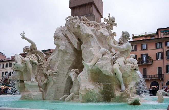 La fontana dei Quattro Fiumi, progettata e realizzata da Gian Lorenzo Bernini nel 1648-51 al centro di piazza Navona, costituisce un’insuperabile creazione barocca.