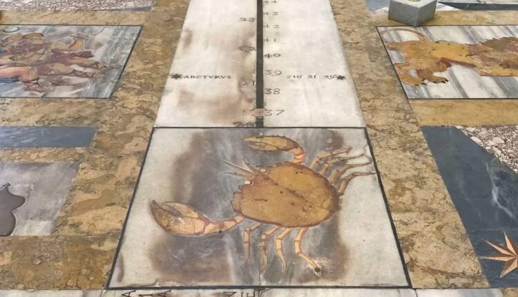 Roma – Nella basilica di Santa Maria degli Angeli e dei Martiri a Roma è possibile ammirare uno strumento astronomico noto come Linea Clementina, dal nome di Papa Clemente XI. Si tratta della meridiana, detta a camera oscura per la presenza di un foro gnomonico, utilizzata per la misurazione del tempo in base alla posizione del sole e dei movimenti astronomici. Fu realizzata in base alla ricerca di una apposita commissione, e inaugurata nel 1702 da Papa Clemente XI. Si compone di una linea di bronzo inserita tra lastre di marmo e distesa quasi in diagonale per 45 metri, ai lati vi sono rappresentati i segni zodiacali in marmi policromi, mentre alle due estremità vi sono i segni del Cancro e del Capricorno.