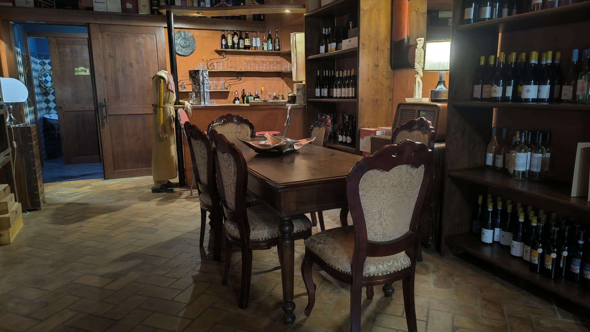 All’interno, la magia continua. Gli ambienti della Locanda sono intrisi di raffinata eleganza: scaffali che custodiscono vini e liquori di pregio dialogano con la calda accoglienza degli arredi. L’atmosfera sprigiona un fascino poetico, una carezza invisibile che accompagna ogni gesto e ogni sguardo.