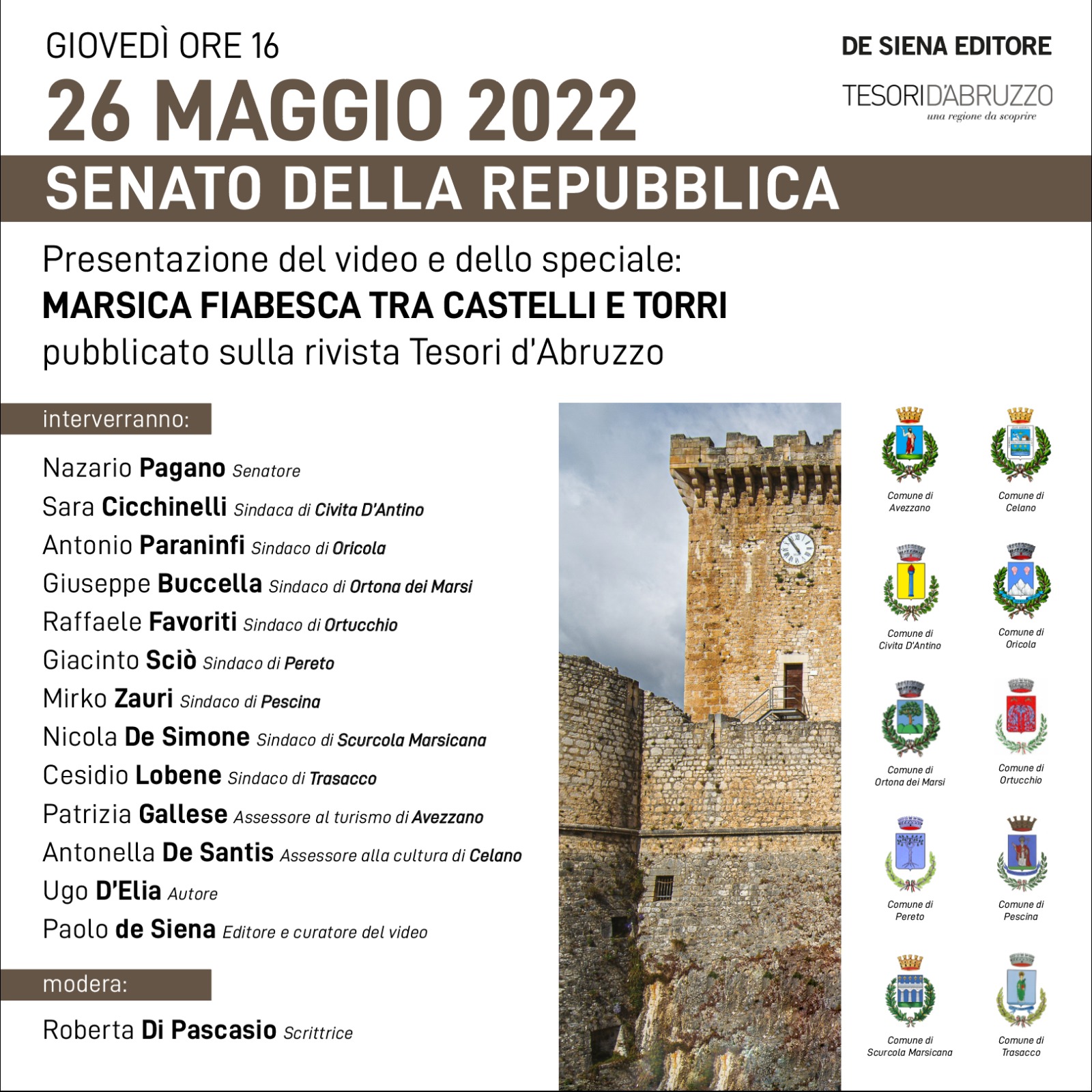 ROMA – Giovedì 26 maggio 2022 alle ore 16 presso il Senato della Repubblica si terrà la presentazione del video promozionale e dello speciale cartaceo pubblicato dalla rivista Tesori d’Abruzzo a firma di Ugo D’Elia “Marsica fiabesca tra castelli e torri”.