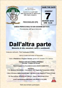 vivere ancora Gianluca nella sua memoria indelebile. E dunque l’appuntamento è per Venerdì 7 Giugno 2019 alle ore 16.00 presso la Chiesa di San Giovanni Battista in Pescosolido dove si svolgerà una cerimonia di commemorazione del Caporal Maggiore con la presentazione di una opera letteraria a lui dedicata ed intitolata “Dall’altra parte“. Si tratta di una raccolta di memorie in cui viene ripercorsa la vita terrena di Gianluca e poi quella vissuta nella dimensione eterna, appunto dall’altra parte. Un romanzo di memorie, sentimenti che ci catapultano in una realtà immaginaria nella quale l’autore, il giornalista Daniele Imperiale, interpreta per l’appunto Gianluca Catenaro. Passaggi forti, toccanti, un modo per mettere su carta, testimonianze, documenti e con l’ausilio della capacità narrativa produrre un racconto che è sicuramente di grande impatto. Moderatore dell’evento sarà il   Prof. Ferdinando SCENNA. Questo il programma: