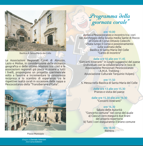 Pescocostanzo – Una giornata intensa quella odierna a Pescocostanzo nel cuore incontaminato dell’Abruzzo, quello vero. L’appuntamento è per quindici associazioni corali regionali provenienti da Lazio, Abruzzo e Molise che partecipano al progetto “Vicini di Canto”. Si tratta di una collaborazione per organizzare occasioni di incontro, di scambio e di formazione tra i cori associati, sempre nello spirito della gratuità, dell’amicizia e dell’appartenenza. Nel 2017 è stata realizzata una “Giornata corale” a Pescasseroli, città baricentrica nel Parco Nazionale d’Abruzzo Lazio e Molise. E questa estate ci si è spostati sul Parco Nazionale della Maiella, a Pescocostanzo, dove oggi i cori sono protagonisti di una bella giornata di canto, cultura, amicizia, buon cibo e bellezza paesaggistica. Il programma prevede concerti itineranti sia al mattino che nel pomeriggio lungo le vie del bellissimo borgo. Protagonista di questo evento anche il Coro Polifonico Piana del Cavaliere che ha preparato un repertorio in grande stile. Ad accompagnare il coro anche l’assessore alla cultura del Comune di Carsoli Alessandra Zazza.