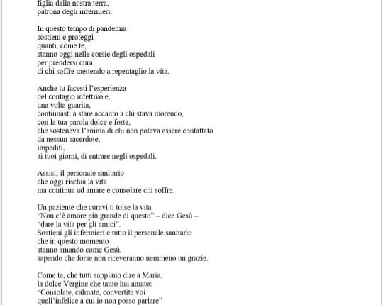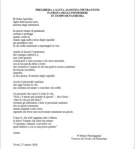 Il vescovo della diocesi di Tivoli, in questi giorni di grande sofferenza e sacrificio da parte di tutto il personale sanitario, ha voluto dedicare a questi eroi contemporanei una preghiera, rivolgendosi a Santa Agostina Pietrantoni, Patrona degli infermieri italiani, il cui corpo è venerato nella sua piccola parrocchia di origine: Pozzaglia Sabina, nella Diocesi di Tivoli. «Chiedo a tutti – invita mons. Mauro Parmeggiani – di diffondere questa preghiera per i nostri infermieri e divulgarla tra gli infermieri e le infermiere stessi. Con gratitudine».