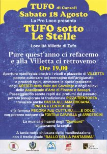 Tufo di Carsoli – L’appuntamento è nella bella e suggestiva cornice di Villetta di Tufo, quando sabato 18 agosto 2018 dalle ore 19.00 la attivissima Pro-Loco aprirà i battenti di “Tufo sotto le stelle”, un evento che è un mix di iniziative per apprezzare la convivialità, degustazioni, e tante curiosità da scoprire insieme.
