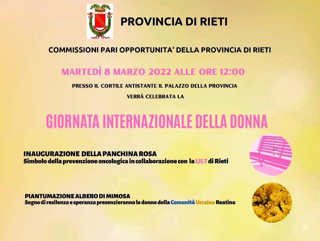 RIETI 6 MARZO 2022 – L’appuntamento con la celebrazione simbolica della giornata internazionale della donna abbinata alla solidarietà per la pace è per martedì 8 Marzo 2022. Presso il cortile del Palazzo della Provincia, si procederà allo svelamento della panchina rosa installata a cura dell’amministrazione provinciale in collaborazione con la Lilt di Rieti. Lo scopo è quello di sensibilizzare le donne sulla prevenzione contro l’insorgenza delle patologie tumorali.