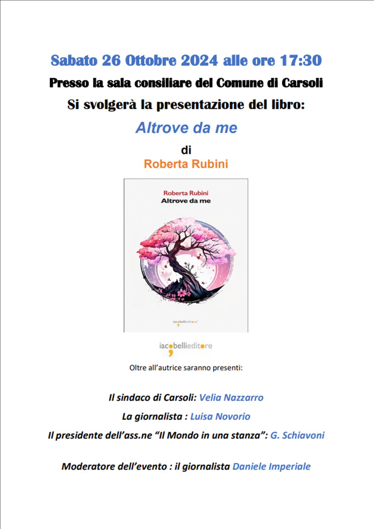 CARSOLI   – C’è grande attesa per sabato 26 ottobre 2024. Appuntamento alle ore 17.30 presso la Sala consiliare del comune di Carsoli. La scrittrice Roberta Rubini presenta il suo ultimo libro dal titolo “Altrove da me”. L’opera, anche questa unica nel suo genere e che immerge il lettore in un viaggio-racconto a dir poco emozionante e rievocativo, è corredata dalla prefazione del professore Antonio Francesco Perozzi,  discutono con l’autrice: l’avv. Velia Nazzarro,  la giornalista Luisa Novorio, il presidente dell’associazione  “Il mondo in una stanza” Giancarlo Schiavoni. L’evento sarà moderato dal giornalista Daniele Imperiale e con i  saluti istituzionali dell’ente. L’evento era stato pianificato già nel settembre scorso.