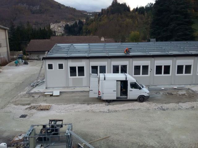 I lavori sono iniziati a settembre con lo scavo e la realizzazione delle fondamenta a opera degli Alpini; il mese successivo è stata innalzata una struttura prefabbricata con 8 classi e un locale mensa, 580 mq, coibentata e antisismica