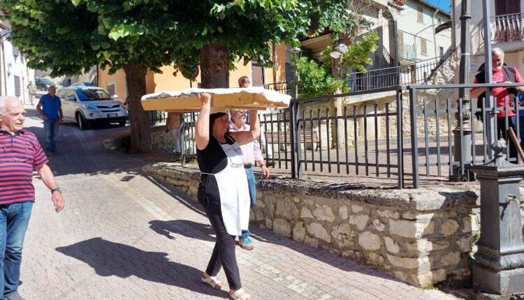 E spuntano le antiche tradizioni, una donna che trasporta la spianatora in testa protetta da un canovaccio, come una volta.