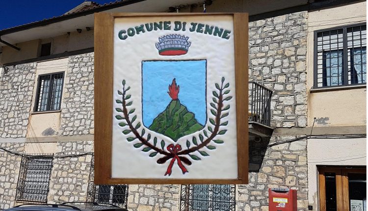 Questa effige trova le sue radici nelle attività prevalenti nel borgo di Jenne, nelle antichissime carbonere, ossia la produzione di carbone destinata poi alla vendita nel comprensorio. Era l’unica fonte di sostentamento, la legna selezionata dal contesto boschivo particolarmente ampio circostante, veniva infatti posizionata in modalità “intrecciata” ad arte. Questo perchè il fuoco ardesse in modo tale da produrre carbone. Il segreto era quello di un intreccio di sapiente architettura tale da favorire il processo per ottenere carbonico, con la giusta quantità di aria e di spazi tra i vari pezzi di legno. Lo stemma originario, di cui si sono perse le tracce riproduceva pertanto la catasta della “carbonera” dalla quale fuoriusciva del fumo e quindi il carbone. Poi con il tempo la rappresentazione dello stemma ha subito delle evoluzioni interpretative tali da far somigliare il contenuto ad un vulcano.