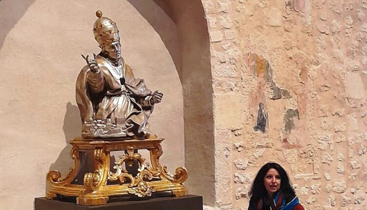 L’Aquila – Dopo un attento restauro è tornato nella Basilica di Santa Maria di Collemaggio a L’Aquila il busto-reliquario di Celestino V in legno intagliato, argentato e dorato a mecca con inserti in rame dorato risalente al XVIII secolo. Il Santo è raffigurato nelle vesti di pontefice, con triregno ornato di vetri colorati in castoni metallici e, nella mano destra, ferula papale con croce a tre braccia (di epoca moderna). La parte superiore del piviale presenta lo stemma pontificio con leone rampante sulla spalla destra, e sulla sinistra quello dell’ordine dei Celestini (alta croce su tre monti, affiancata da due fiordalisi, sulla cui asta inferiore si avvolge una serpe). Il bottone del piviale fungeva da urna-reliquario; oggi vuota, è stata coperta di tessuto nero. Sotto il braccio destro, innalzato nel gesto di benedizione, è poggiato il modellino della città di L’Aquila, a rappresentare la devozione della comunità verso il Santo eremita e pontefice.