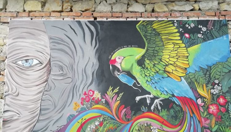 Tufo di Carsoli – L’edizione di Intonaci 2020 a Tufo di Carsoli ha visto protagonista tra le tante bellissime, una opera muraria particolare realizzata in tandem dagli artisti Paolo Di Censi e Lorenzo Di Gabriele. “Per chi è andato e per chi resta”. Questo è il titolo ed il dipinto con note reali e surreali rappresenta di fatto una fase emergenziale impensata. Questo rapace che porta la “mascherina” tra i suoi artigli, e le cui piume sembrano fondersi con la natura sottostante, espressa tra fiori, colori di vegetazione e fino al congiungimento con l’uomo nella sua evoluzione. Il volto è triste, quasi inespressivo e proiettato verso l’ignoto. Di qui sicuramente si trae il pensiero per quanti hanno perso la vita a causa del covid e tutta l’umanità che in vita deve fronteggiare questa fase emergenziale che purtroppo sembra essere ancora molto lunga.